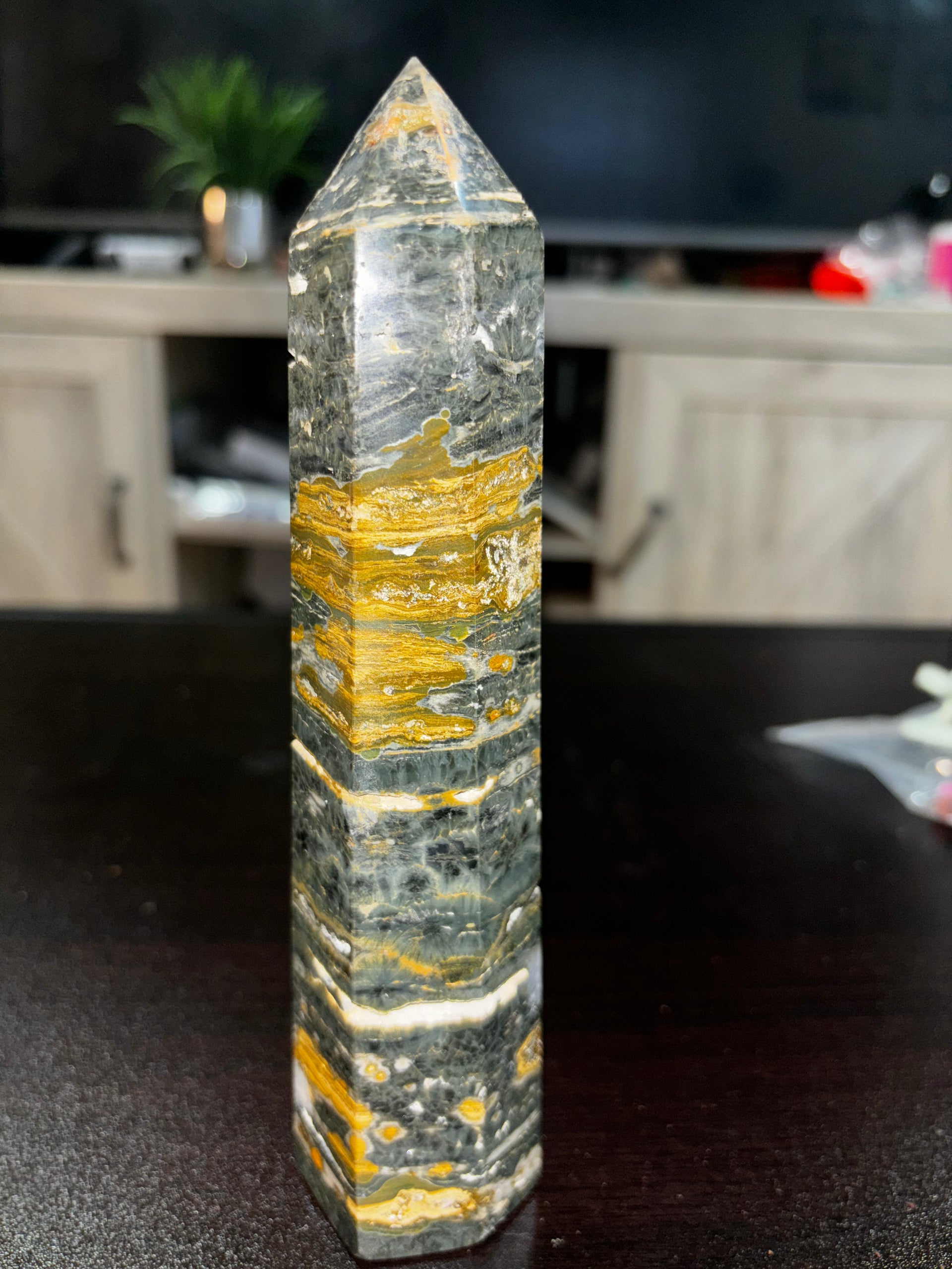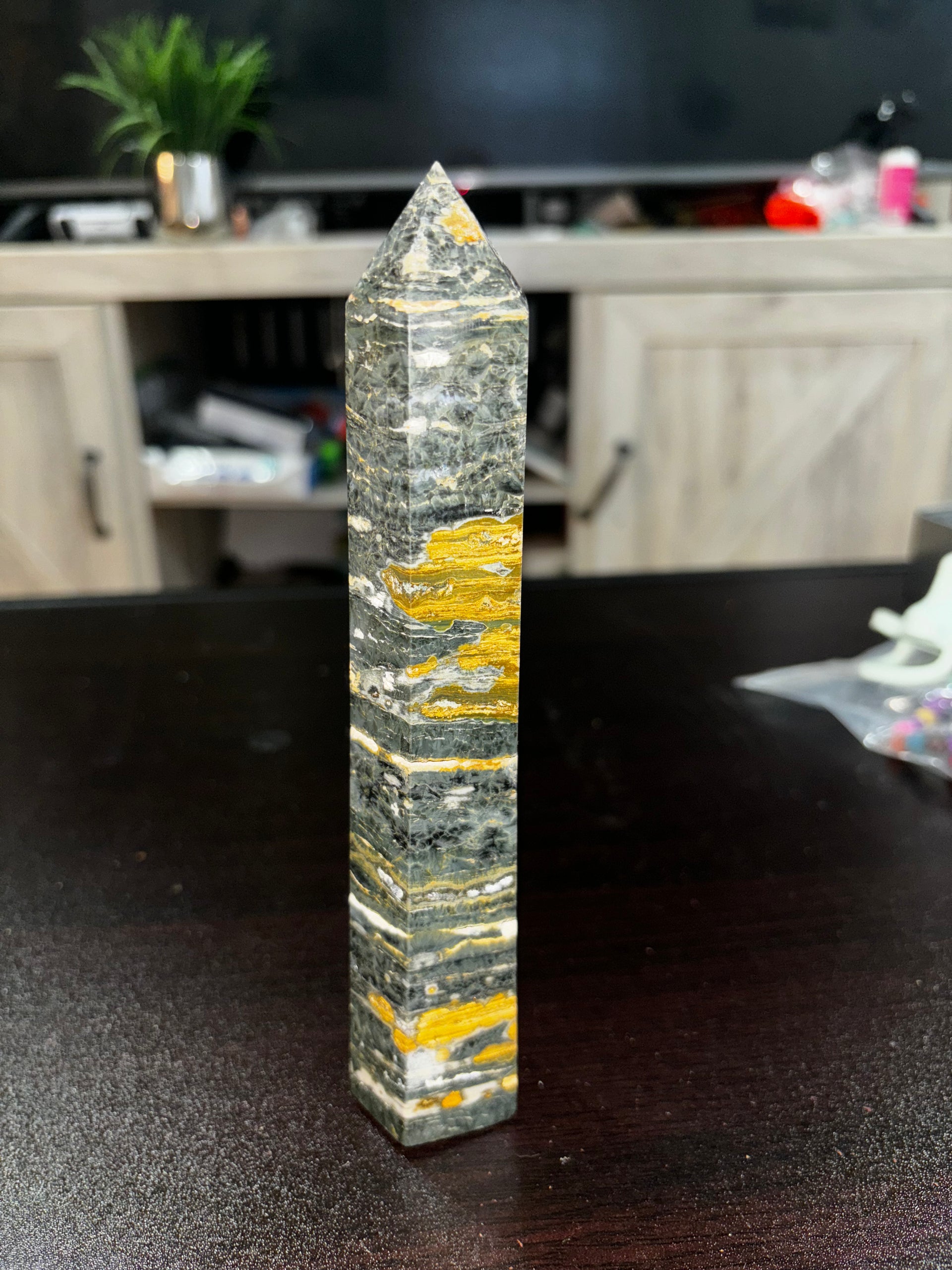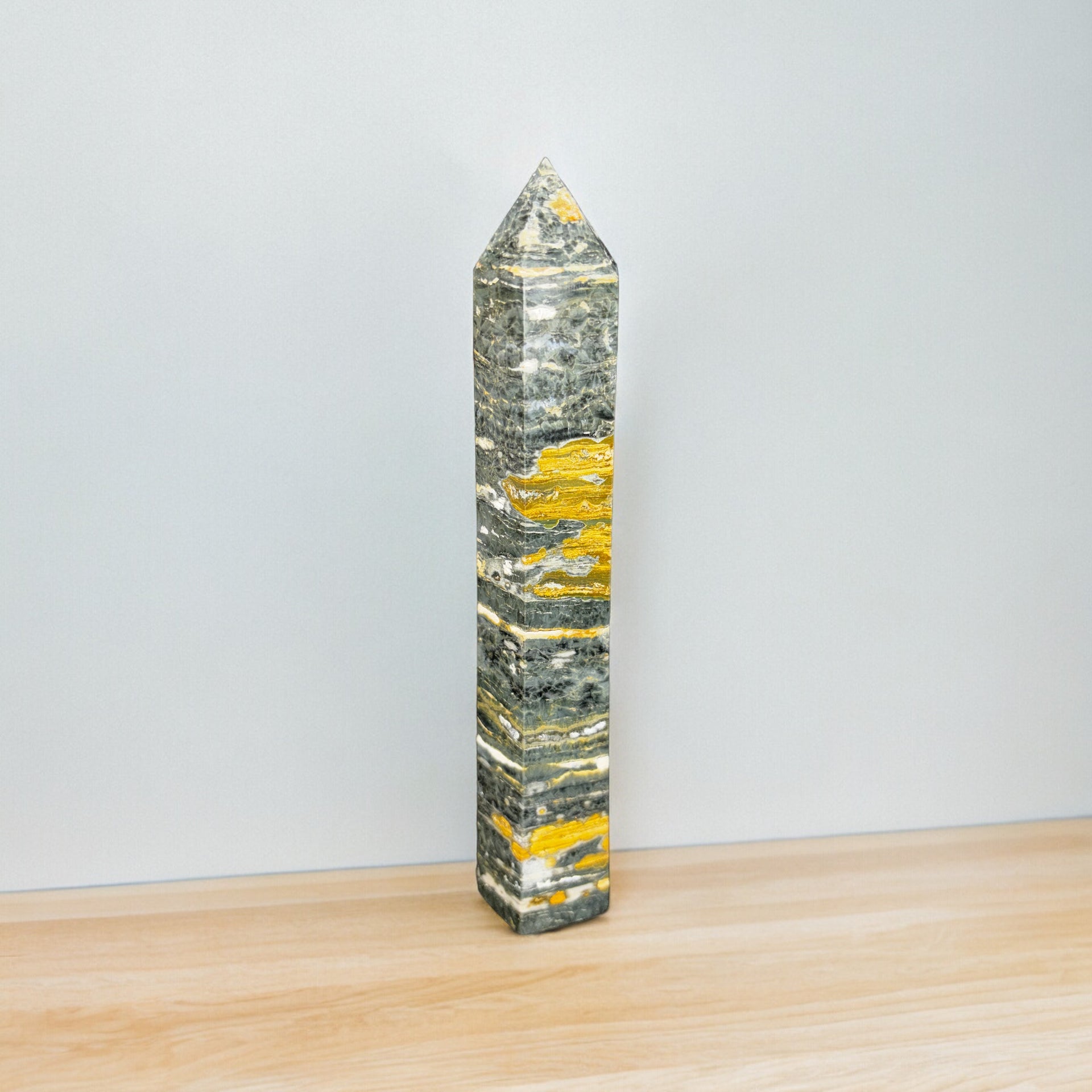 Elevate your energy with the stunning Bumble Bee Jasper Tower! This unique tower features vibrant swirls of yellow, gold, and black, providing a powerful boost of energy and motivation. Perfect for meditation and crystal healing, it's a must-have for any crystal collector.