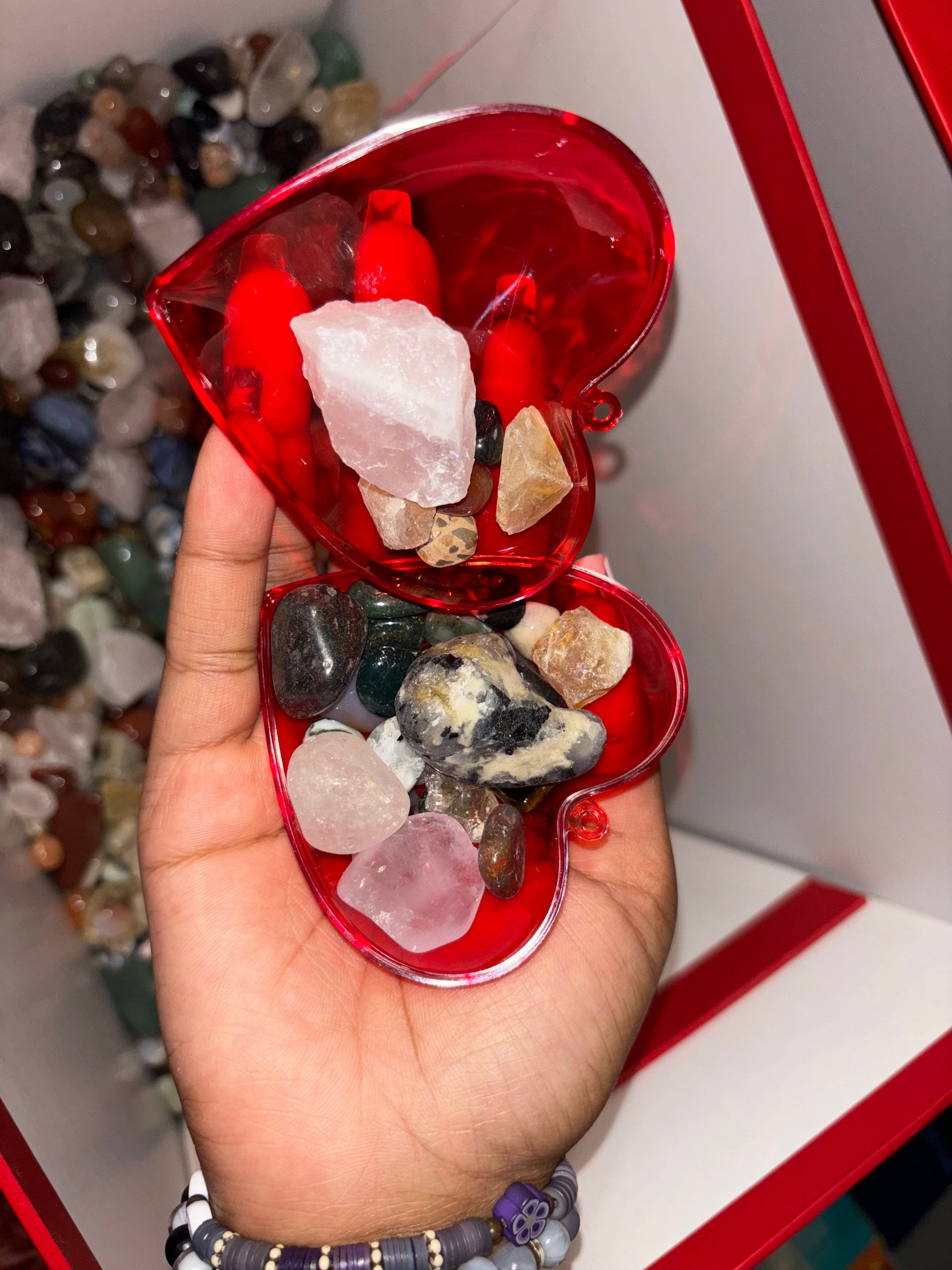 Crafted with love and intention, these bags are adorned in festive Valentine's Day-themed material, adding an extra touch of romance and celebration. Inside, awaits a kaleidoscope of crystals – a vibrant mix of sizes and textures, ensuring no two bags are alike. It's like receiving a love letter from Mother Earth herself!