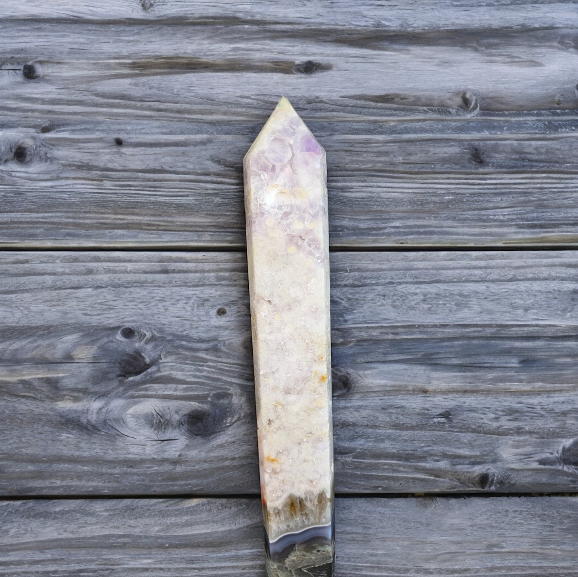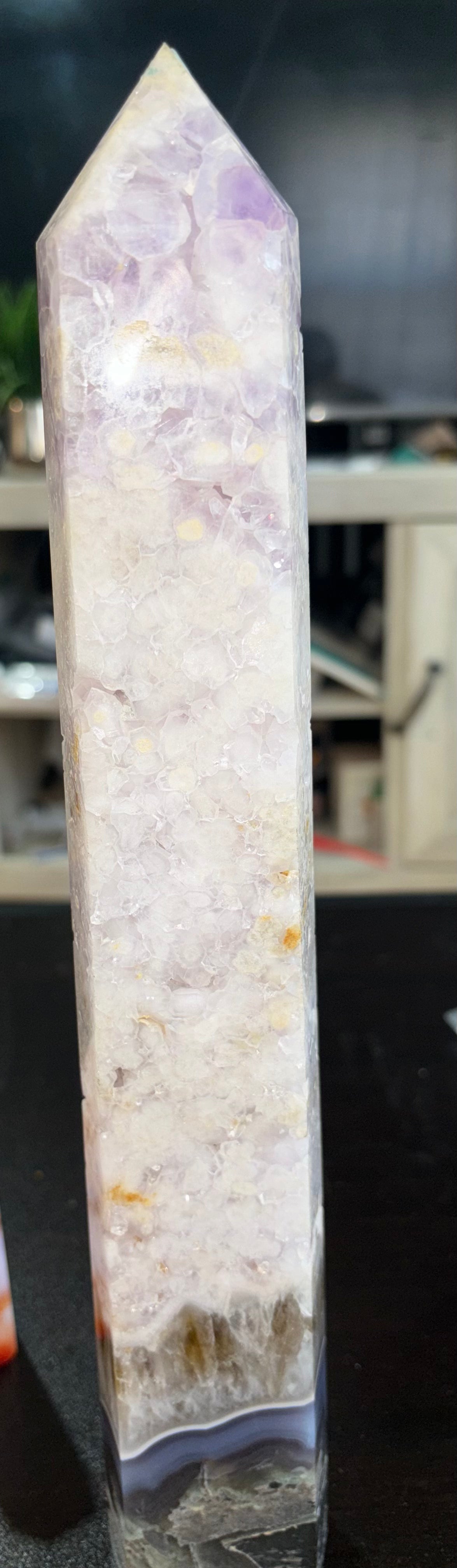 Elevate your space with our Large Chevron Amethyst Tower. This stunning piece not only adds an element of natural beauty, but also promotes calmness and clarity. Perfect for meditation and enhancing positive energy. A must-have for any crystal lover!