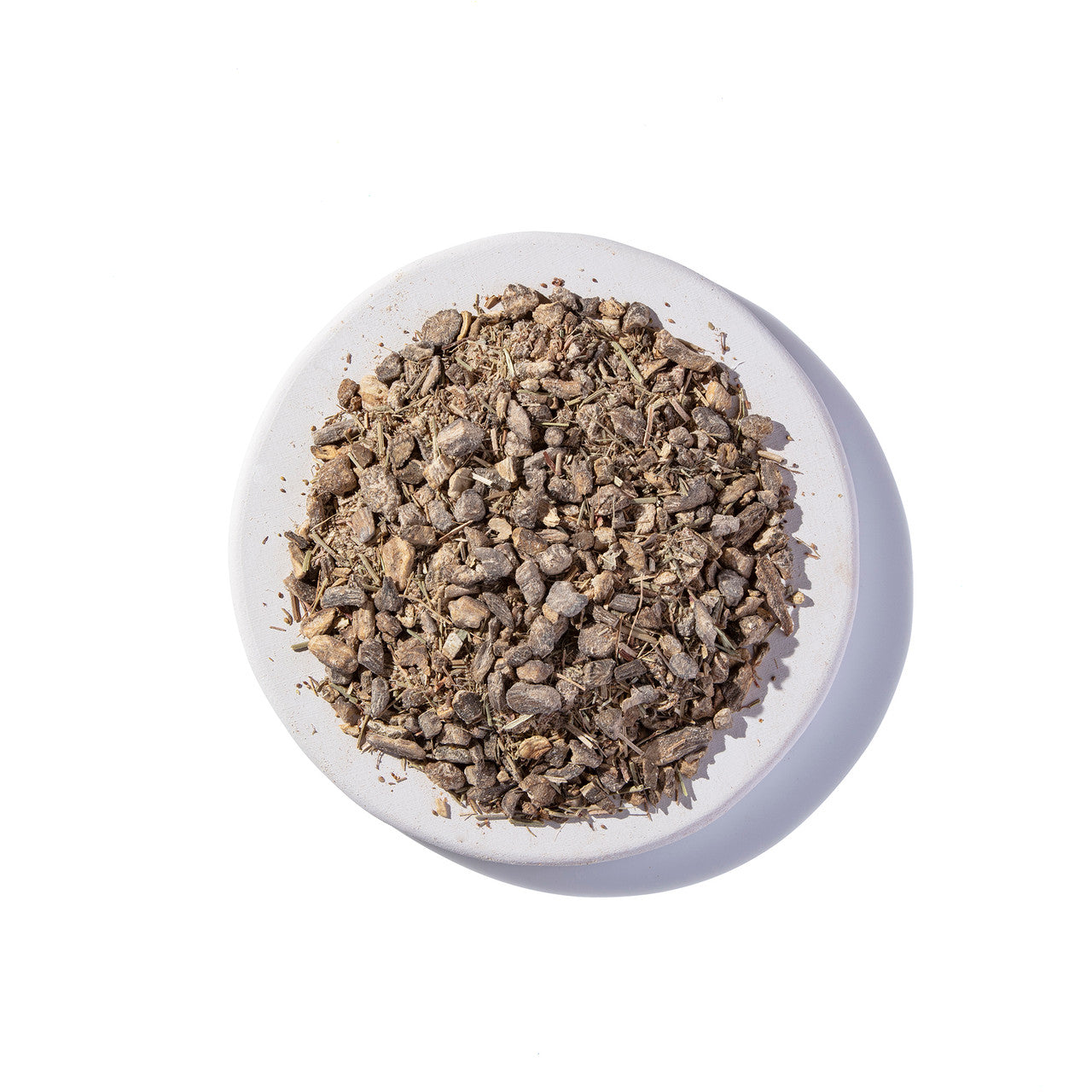 Organic burdock root, organic sheep sorrel herb, organic slippery elm bark, and organic (Turkey) rhubarb root.