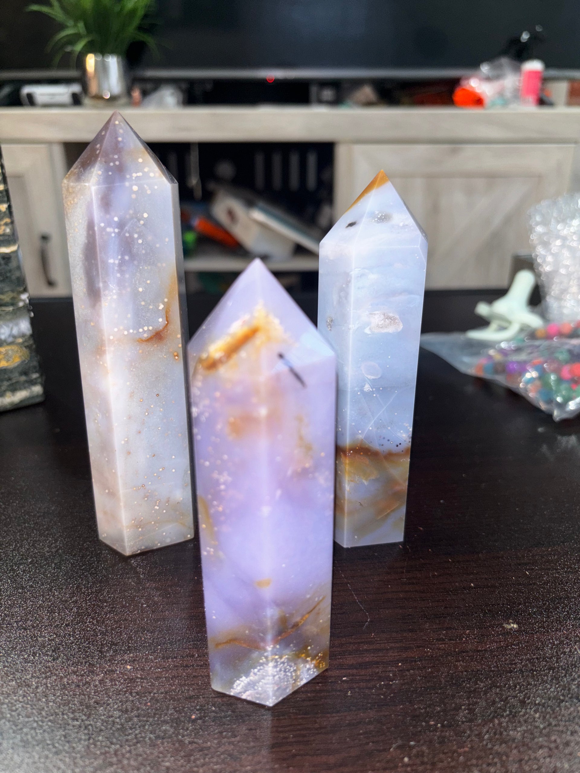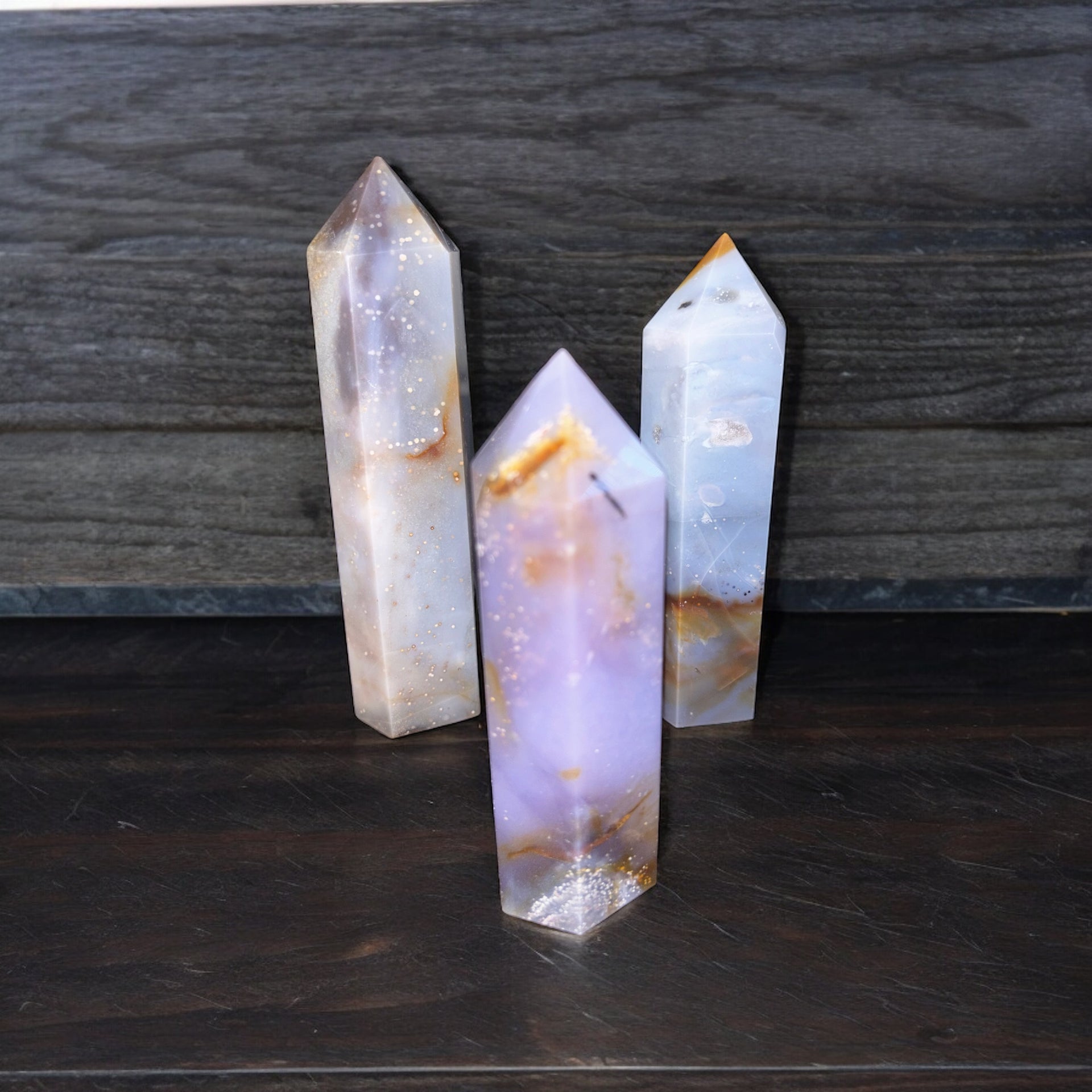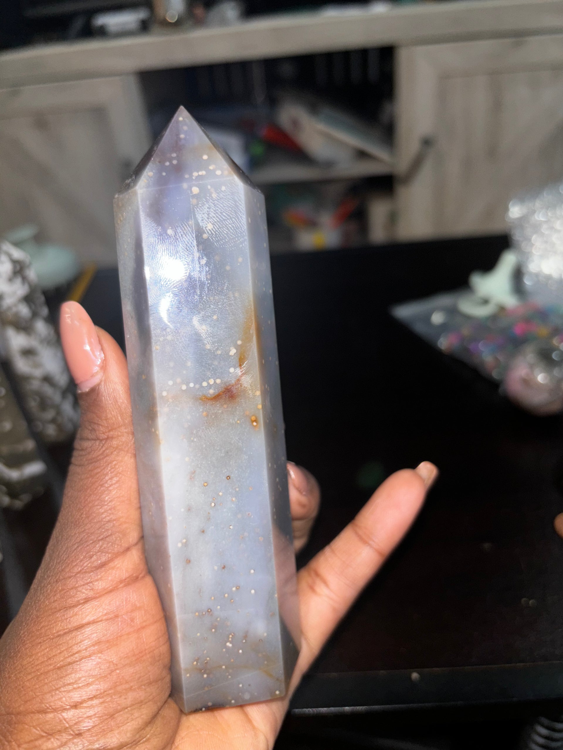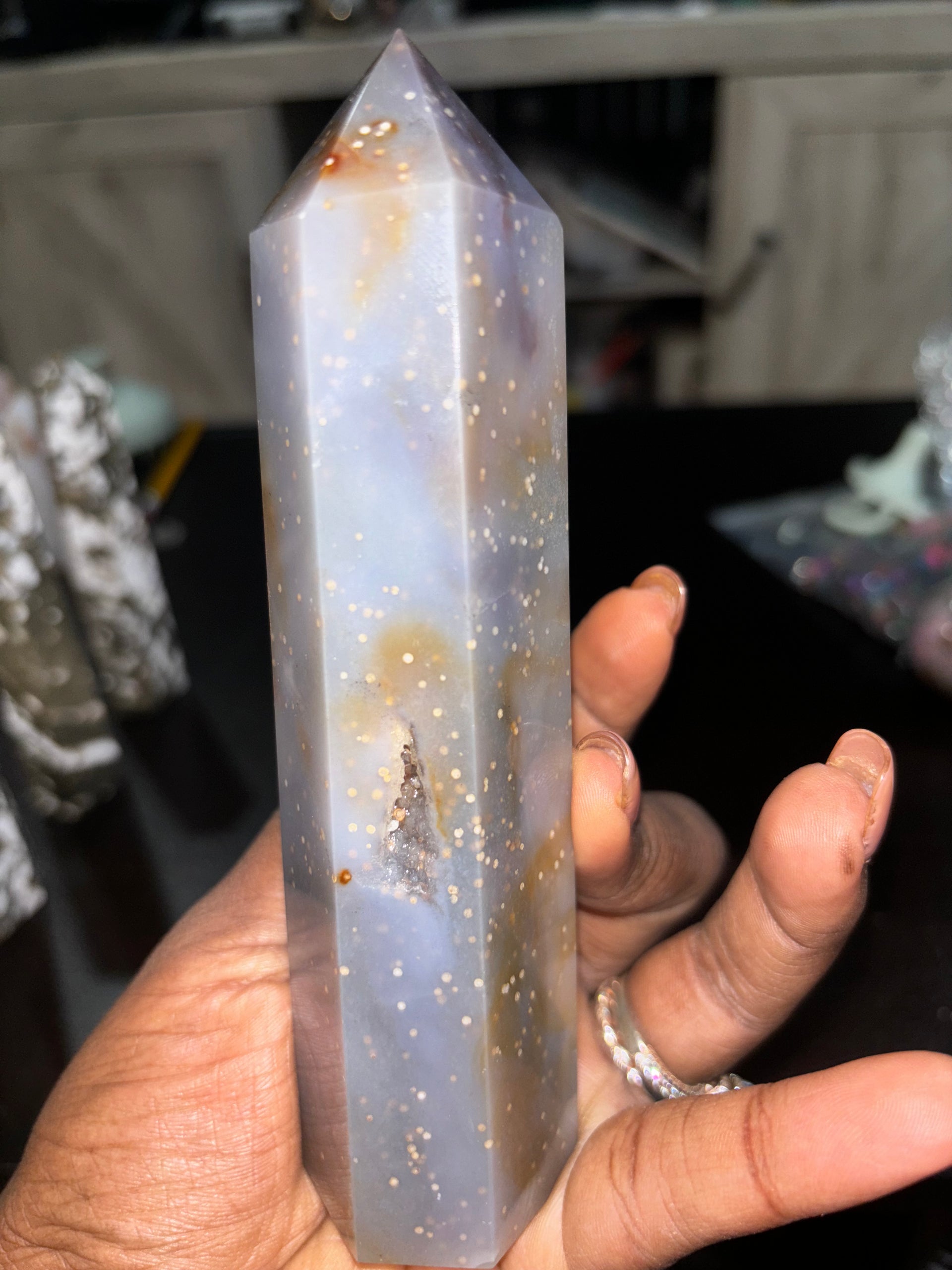"Get your spiritual vibes soaring with our Blue Chalcedony Tower! This beautiful tower is made of blue chalcedony, a stone that promotes calmness and harmony. Perfect for meditation or adding a touch of tranquility to any space. Bring on the zen!"