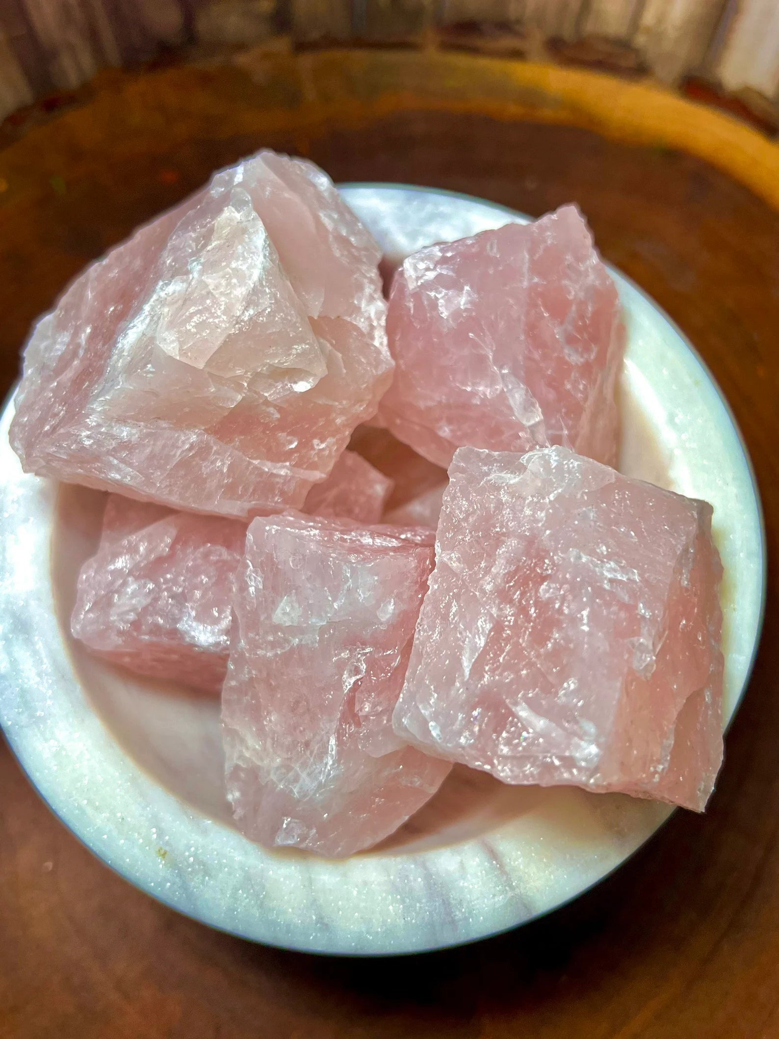 A single rough piece of Rose Quartz is intuitively chosen.
